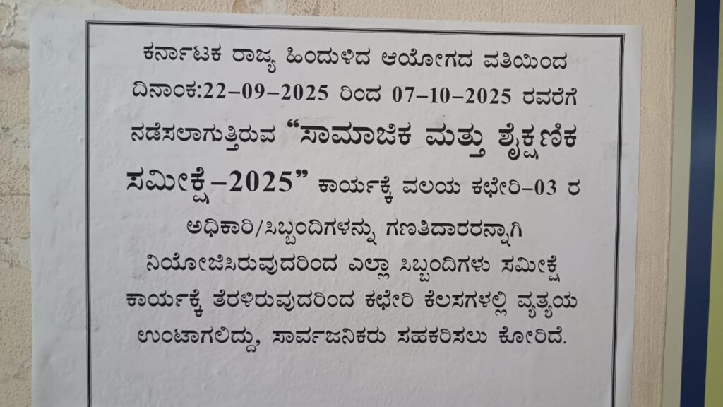 ದಾವಣಗೆರೆ: (Census) ನಾಗರೀಕರ ಸಾಮಾಜಿಕ ಮತ್ತು ಶೈಕ್ಷಣಿಕ ಸ್ಥಿತಿಗತಿಗಳ ಬಗ್ಗೆ ಸಮೀಕ್ಷಾ ಕಾರ್ಯವನ್ನು ಪ್ರಸಕ್ತ ಸಾಲಿನಲ್ಲಿ ಕರ್ನಾಟಕ ರಾಜ್ಯ ಹಿಂದುಳಿದ ವರ್ಗಗಳ ಆಯೋಗದ ವತಿಯಿಂದ ಕರ್ನಾಟಕ ರಾಜ್ಯದ ನಾಗರೀಕರ ಸಾಮಾಜಿಕ ಮತ್ತು ಶೈಕ್ಷಣಿಕ ಸ್ಥಿತಿಗತಿಗಳ ಬಗ್ಗೆ ಸಮೀಕ್ಷಾ ಕಾರ್ಯವನ್ನು ಸೆ.22 ರಂದಿ ಅ.7 ರವರೆಗೆ ಆಯೋಜಿಸಲಾಗಿದೆ.