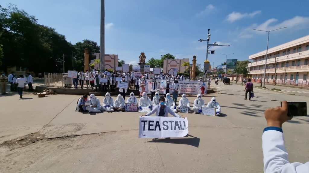 ppe kit & tea stall: ಗೃಹವೈದ್ಯರ ಮುಷ್ಕರ ನಾಲ್ಕನೆ ದಿನಕ್ಕೆ: ಟೀ ಸ್ಟಾಲ್, ಪಿಪಿಇ ಕಿಟ್ ಧರಿಸಿ ಆರ್ಥಿಕ ಸ್ಥಿತಿ ಬಗ್ಗೆ ಅಣಕು ಪ್ರದರ್ಶನ ತೋರಿದ ವೈಧ್ಯರು